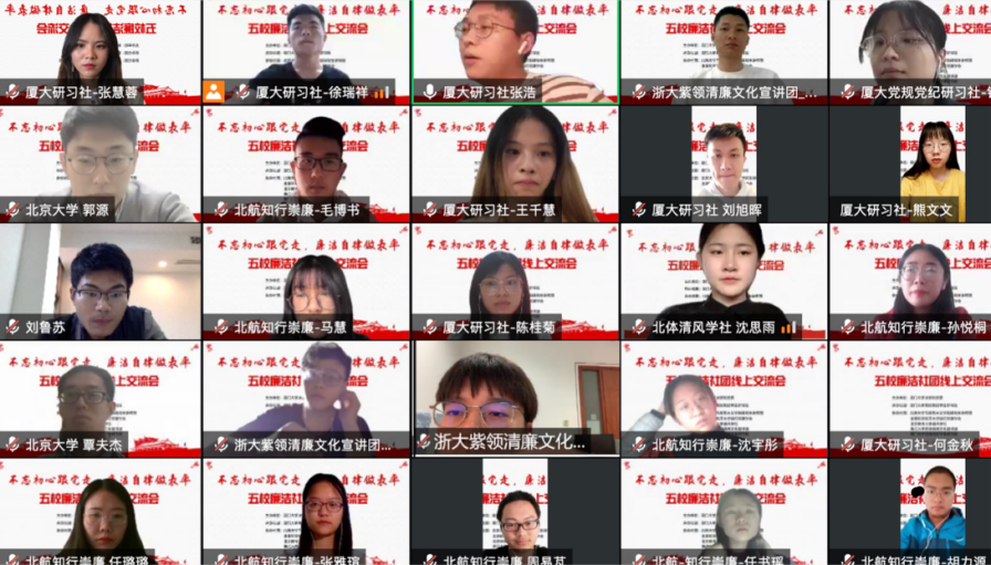 2020年10月31日,为落实全面从严治党,推进“两学一做”学习教育常态化、制度化,提高学生党员的廉洁自律意识,研习社联合北京大学马克思主义学院研究生讲师团、北京航空航天大学知行崇廉学会、北京体育大学清风学社、浙江大学紫领清廉文化宣讲团成功举办以“不忘初心跟党走,廉洁自律作表率”为主题的五校廉洁社团交流会,围绕廉洁社团的建设共同分享经验、探讨难题,奠定了各高校廉洁社团进行更深入合作交流的基础,也为研习社日后继续完善廉洁社团的发展、丰富廉洁活动的开展、促进廉洁文化的建设提供了新思路。