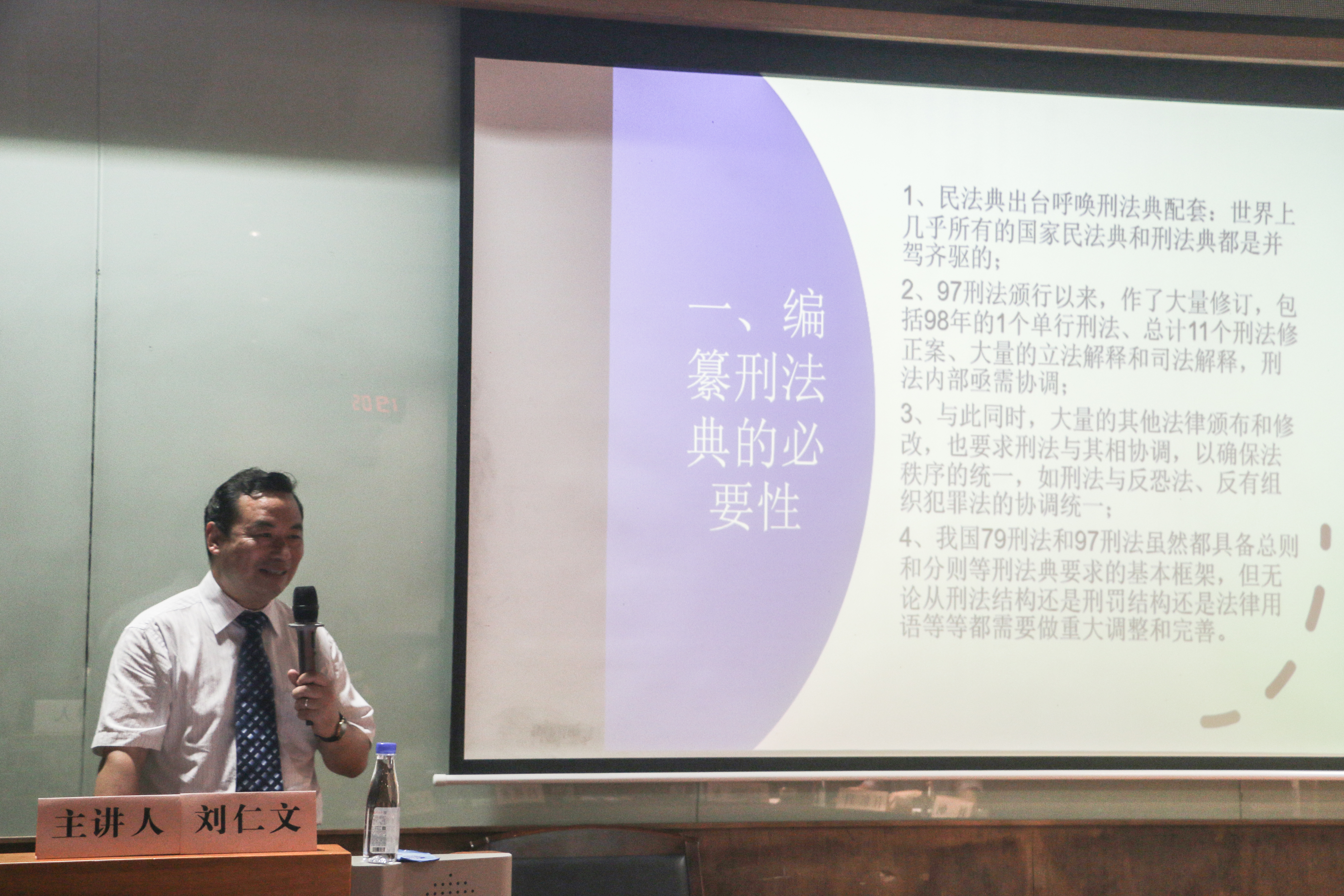 刘仁文教授对本次讲座的背景和缘起进行了简要介绍阐述,而后围绕刑法典编纂这一主题构想,分三个部分做了精彩演讲,分别是编纂刑法典的必要性、编纂刑法典的具体设想,以及其他几个需要说明和研究的问题。