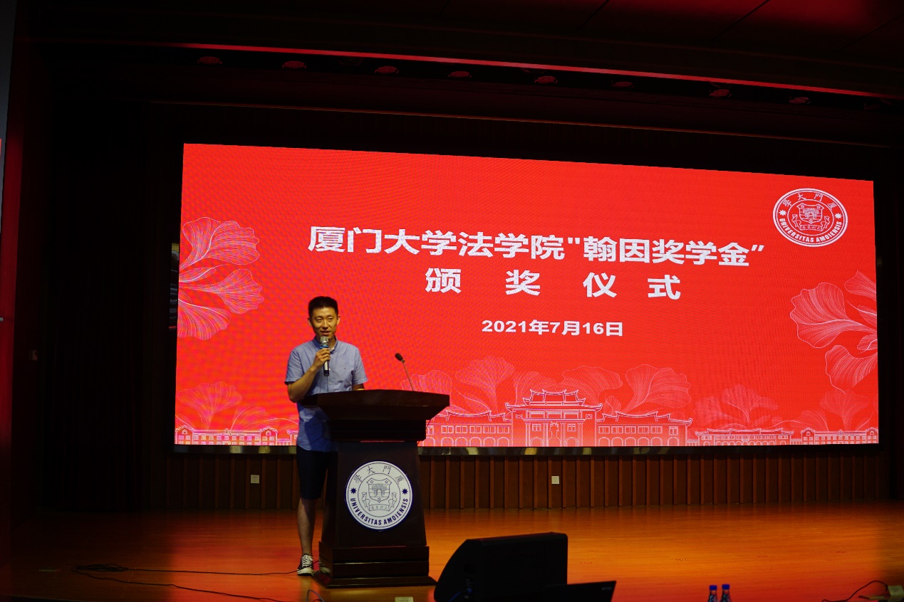 最后,2017级博士研究生周聖代表所有获奖者发言。他诚挚感谢奖学金资助方、国际法学科老师们的辛勤培养。临近毕业的他回顾了在廌园学习的历程,他自豪于进入厦大国际法学科,感受着如大家庭般团结的学科凝聚力,也得益于法学院严谨认真的学术氛围。他表示此次获奖,既是对自己过去学术生活的肯定,也激励学子不忘初心、将来争取更大进步。