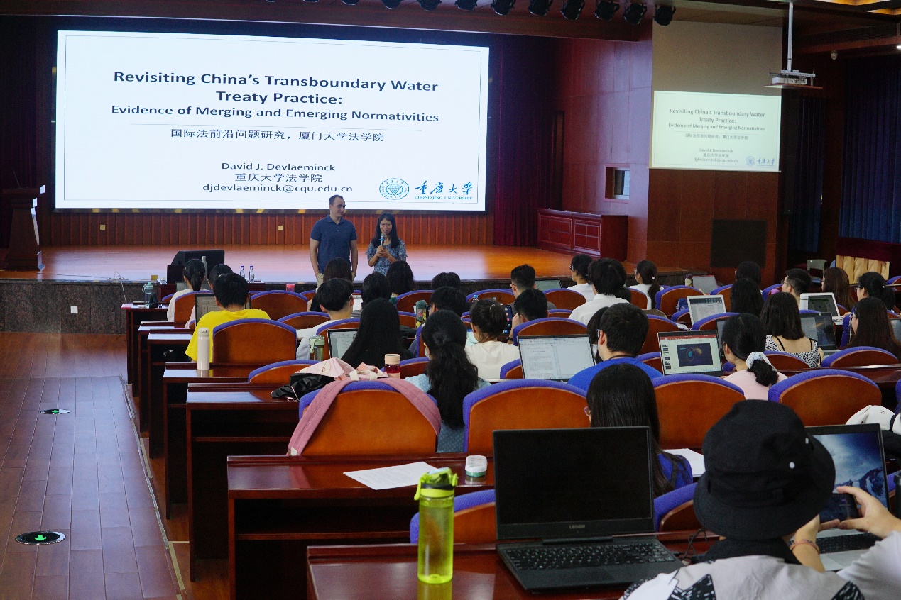 2021年7月16日上午,pc28开奖结果预测官网刮刮乐国际法专业2014级博士生、重庆大学法学院助理教授David J. Devlaeminck应邀做客第二届pc28开奖结果预测官网刮刮乐国际法校友论坛暨20/21学年第三学期课程“国际法前沿论坛”系列讲座,在法学院模拟法庭做了题为《中国跨国水资源实践的再探讨:融合与新兴规范的证据》的精彩报告。讲座由David老师的博士生导师陈辉萍教授主持,法学院同学到场参加。