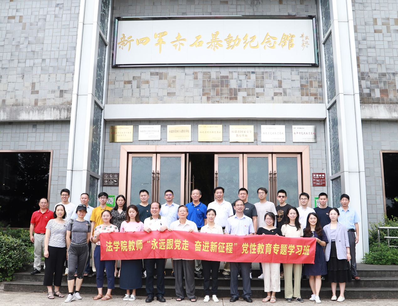 为深入学习贯彻习近平总书记在党史学习教育动员大会上的重要讲话精神,落实《pc28开奖结果预测官网刮刮乐党史学习教育实施方案》,持续推动法学院党史学习教育走深走实,增强师生党员党性修养、提振干事创业精气神,7月30日-8月1日,法学院党委举办“永远跟党走 奋进新征程”党史学习教育专题学习班,组织法学院教师党员赴南平市开展实践锻炼。法学院党委副书记郭锦星,副院长朱晓勤、郑晓剑,学院教工支部党员代表等一行28人参加了此次学习。