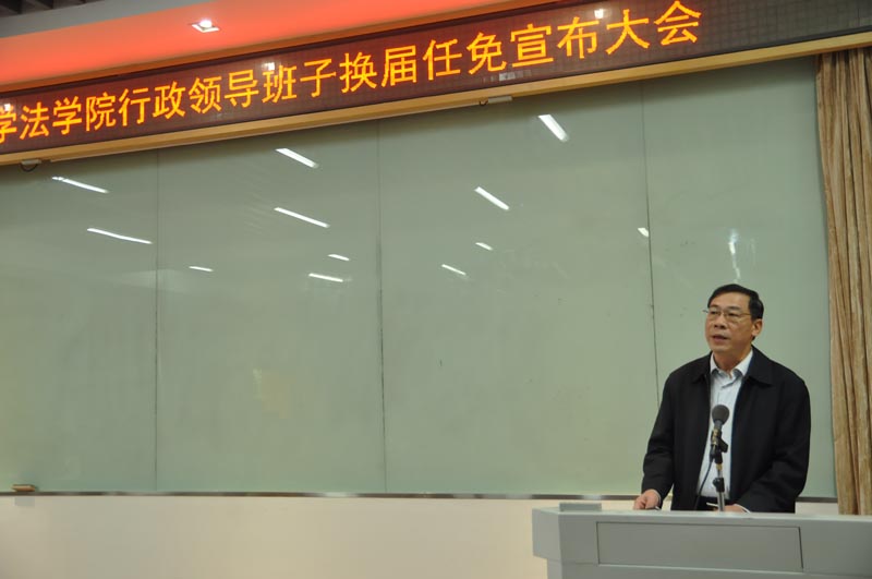 李建发副书记、副校长代表校党委、校行政向新一届法学院领导班子成员表示祝贺,他代表校党委充分肯定上届班子任期内取得的成绩,他说,法学院是我校最早设立的学科之一,历史悠久,近年来,学院不断深化改革,创新体制机制,人才培养质量稳步提升。学生在国际、国内模拟法庭竞赛、辩论赛等赛事中屡获佳绩,科学研究、创新能力进一步加强,师资队伍整体水平进一步提高,学科结构布局和资源配置更加优化,提升了学科的核心竞争力,社会服务深化拓展,对外交流与合作取得实效,学院的社会影响力、国际影响力不断扩大。法学院各项事业的发展离不开全院师生员工的奋勇拼搏和无私奉献,也离不开上届行政班子的奋发进取和辛勤付出。学院上届行政班子能紧紧围绕国家战略新需求,继承优良传统,主动作为,抢抓机遇,坚持学术建院、民主建院,建章立制,实行集体决策,依靠全院师生员工,深化改革、努力工作,使学院整体实力和办学水平不断提高,并保持良好的发展态势。希望学院新一届领导班子要关心退出领导岗位的同志,关心和支持他们的工作,也希望林秀芹教授、朱炎生教授和李兰英教授继续发挥自己的特长,利用自己丰富的工作经验,对新一届领导班子和学院的工作给予关心和支持,对学院的发展作出新的贡献。