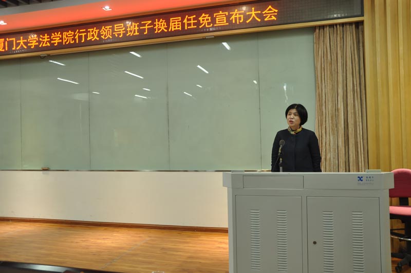 宋方青院长对校党委及学院同事的信任、支持和认可表示感谢,表示将不辜负广大教职工的厚望、学校的期待和重托,坚持“学术建院、民主建院”的原则,把法学院的工作做好,做扎实,将法学院的事业继续推向前进,在“双一流”的建设中再创辉煌。她对法学院近两年的工作情况作了简要概括:从2015年底开始,学院借助90周年院庆,凝聚各方的力量,扩大了影响,使学院整体实力更上一个台阶,法学院的教学环境、科研环境以及工作环境,得到了很大的提升,在人才培养、师资队伍建设、科学研究、对外合作交流、文化传承等方面都取得了新的成就。两年来,学院顺利完成一级学科的评估,法律硕士、法学硕士的合格评估;学院师生顽强抗击了莫兰蒂台风,承接了多次法学二级学科的全国性年会,以及法学教育指导委员会的年会。2016年,由法学院出资出版的著作达24部,久违的国家社科重大项目,教育部重大攻关项目都在最近获得。宋院长表示,这些取得的成绩,与广大教师的努力,与全体班子成员的共同协力合作,以及前几任院长奠定的良好基础是分不开的。她代表学院班子,对三位卸任副院长所作出的奉献表示衷心的感谢。