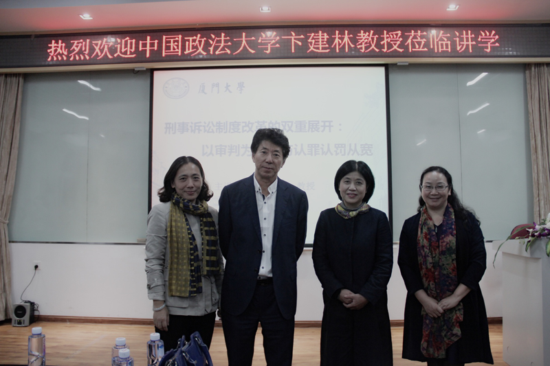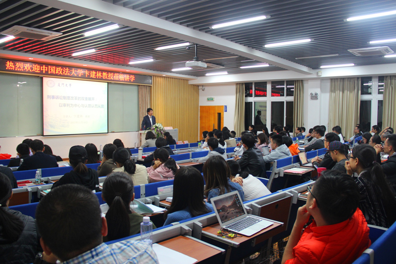 卞建林教授从“以审判为中心”和“认罪认罚从宽”两个角度,对当前的刑事诉讼制度改革进行了深入剖析,从司法改革背景下审判中心主义的由来、内涵、司法运作中的客观效果,及其与认罪认罚从宽机制的关系等几个层面娓娓展开。卞建林教授指出,以审判为中心与认罪认罚从宽是当前司法改革领域的热门议题;深入解构以审判为中心的诉讼改革和认罪认罚从宽制度,是理解当前刑事诉讼制度改革精髓与要义、逻辑与思路、问题与出路、背景与前景的有效方法和路径。卞建林教授从冤假错案的发生原因、诉讼机制、司法权力的配置等方面分析了司法系统的现存问题,深入分析了认罪认罚从宽制度的立法背景,指出以审判为中心的合理性、重要性,并点出制度推行中将会遇到的问题,如罪名、罪数的不可交易性,可以适用的案件范围边界等。卞建林教授作为刑事诉讼制度改革的重要参与者和见证者,更是践行者,他的讲座内容恢宏大气又细致入微,既有高深理论也有实践的反思。观点深刻而不失风趣幽默,一气呵成而又层次分明。卞建林教授是在持续两天的高强度头脑风暴的学术会议之后全程站姿进行讲座的,在互动环节,他也是耐心回应,层层递进,令全场师生感动不已。
