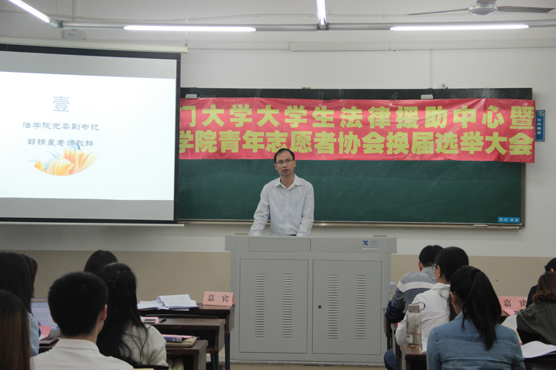 大会开始,pc28开奖结果预测官网刮刮乐党委副书记郭锦星老师上台致开场辞,郭老师用质朴系统的总结了过去一年来pc28开奖结果预测官网刮刮乐大学生法律援助中心暨学院青年志愿者协会工作上的成绩,同时对于新一届候选人的整体水平表示格外欣慰,最后也代表学院对我们提出了更高的要求、期许,对法援和青协的未来的给予期待与祝福。