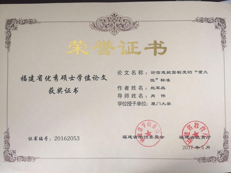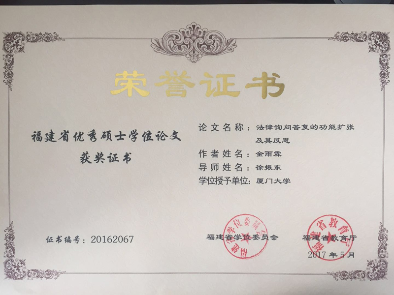 我院共10篇论文获评2016年福建省研究生优秀学位论文 发布人: admin | 发布时间: 2017-09-21 | 阅读数: 日前,福建省学位委员会、福建省教育厅正式公布了2016年福建省研究生优秀学位论文评选结果,我院共有10篇获选省优秀硕士学位论文,现将评选结果予以公布。 福建省研究生优秀学位论文的评选,旨在建立与完善研究生培养的质量监督和激励机制,提高研究生培养和学位授予质量。2016年共评出福建省研究生优秀学位论文242篇,其中优秀博士学位论文40篇、优秀硕士学位论文202篇。 图/文 易乐也