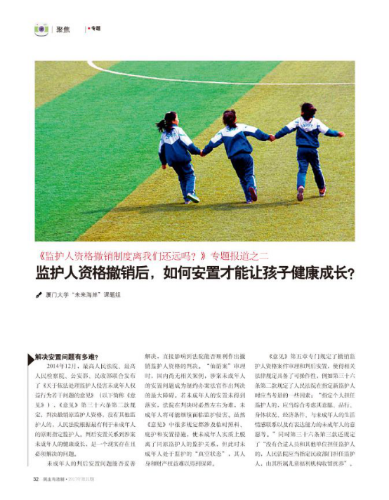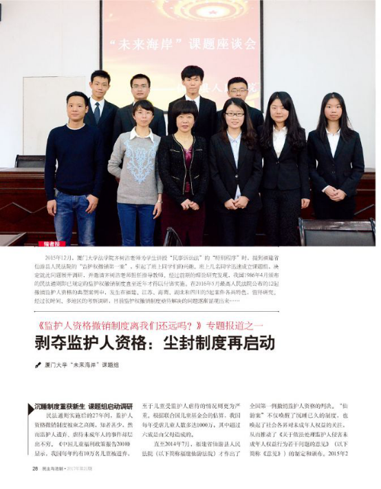 2017年6月9日,中央政法委主管、中国法学会主办的刊物《民主与法制》2017年第21期刊登了两篇我院“未来海岸”课题组撰写的调研报告:《剥夺监护人资格:尘封制度再启动》和《监护人资格撤销后,如何安置才能让孩子健康成长?》。