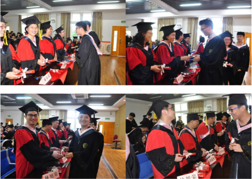 会上,周蕾副书记代表学院接受了毕业生向母院赠送的毕业纪念册。与会老师身穿深红色导师袍向全体毕业生赠送了精美的毕业寄语。毕业寄语饱含着全体老师对学子的美好祝愿。同学们纷纷举起相机,记录下这神圣又激动的时刻。最后,毕业典礼在高昂的校歌声中落下了帷幕。