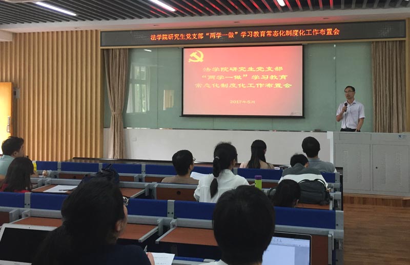 5月18日,法学院在B137教室召开研究生党支部“两学一做”学习教育常态化制度化工作布置会,法学院党委副书记郭锦星、团委书记高斌、辅导员宋磊华、全体研究生党支部委员参会,会议由团委书记高斌主持。