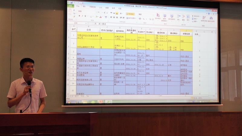 第一位介绍的是王素芬学姐,她从投行和律所实习和求职两方面为同学们进行了介绍。她强调,下一届同学时间紧,想要进入投行的同学一定要抓住暑期实习的机会,这样才有更高概论争取实习留用。对于律所的实习和求职历程,她总结的经验是首先要厘清诉讼和非诉业务的区别,了解自己喜欢和擅长的领域。对于她长期操作的非诉业务,素芬学姐表示一定要经过长时间的潜心实习,全方位了解才能知道自己的兴趣、能力与职业岗位是否匹配。其次,她以亲身的实习和求职经历过的律所为同学们介绍了各律所的大致薪资和实力状况,并且贴心地告诉同学们,分析律所的待遇构成需要考虑工资、年终奖、提成和入职后2-5年的发展前景等因素。最后,在自身能力的提高上,素芬学姐尤其强调英语水平的锤炼,并且在简历准备方面,学姐提醒,可以准备一份英文简历,且在简历的内容上,实习经历是最重要的部分,在准备时应当具体到自身参与的具体项目和起草的文件,这样既能突出自己在实习时学到的经历又能掌握面试的主动权。