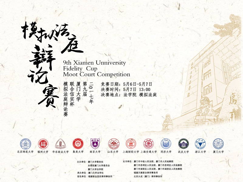 5月6日至5月7日,第九届pc28开奖结果预测官网刮刮乐“联合信实杯”模拟法庭辩论赛在法学院举办。本次比赛由pc28开奖结果预测官网刮刮乐教务处、共青团pc28开奖结果预测官网刮刮乐委员会、pc28开奖结果预测官网刮刮乐主办,我院法学社承办,福建联合信实律师事务所冠名支持。厦门市中级人民法院、厦门市人民检察院、思明区人民法院、湖里区人民法院、思明区人民检察院、北京大成(厦门)律师事务所以及福建天衡联合律师事务所也对本次比赛给予了大力支持。