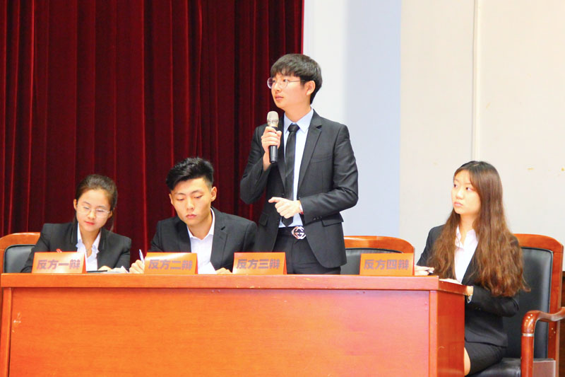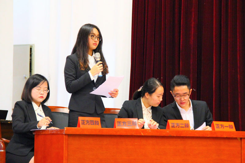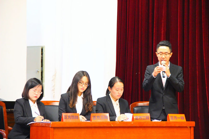立论环节中,正方一辩,来自法学院2014级三班的陈理民,首先明晰“司法工作”和“人工智能”的概念,指出判断司法工作能不能被人工智能所取代,就是在于人工智能能不能具有完成公正审判的能力。随后,他从人工智能具有准确收集、运用证据的能力,分析口头辩论的能力,判断被害人、被告人、证人可信度的能力以及合理运用庭审经验的能力四方面来支撑其观点:“司法工作能够被人工智能取代”。