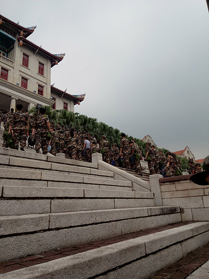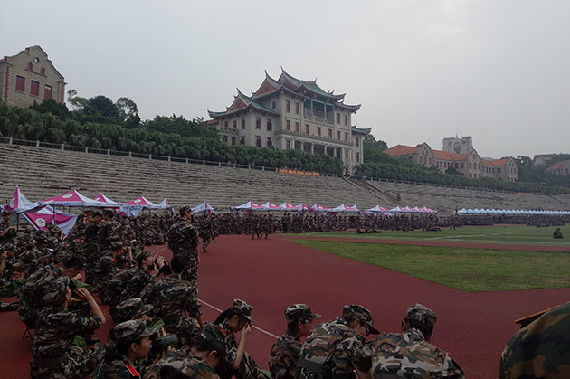 站军姿,走正步,行军礼……我们从稀稀拉拉到整齐划一,从偶开小差到全神贯注,团队意识渐渐树立。一遍遍的重复温习只为打造更加优秀的厦大人。雨前的闷热逼得汗水不断淌下,虽衣裳已湿,但我们的热情依旧饱满。教官循循善诱,尽心尽力,让我们感叹军人的热血与柔情。我们全力以赴,众志成城,信念与信任紧密结合,坚定与坚持相辅相成。正如校训所云:自强不息,止于至善,一支支稍显稚嫩但精诚团结的队伍正在形成……