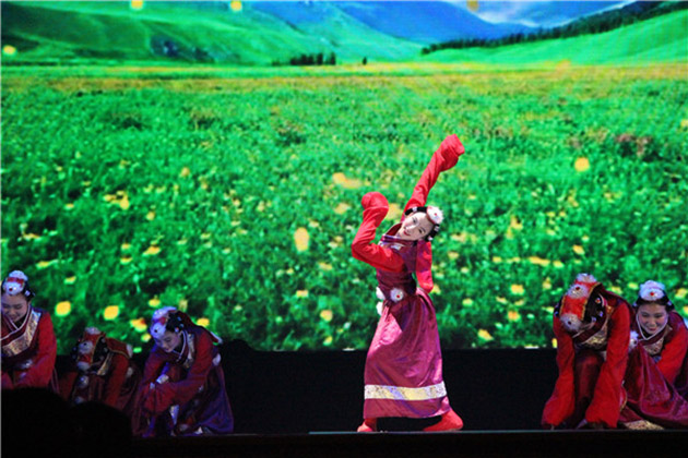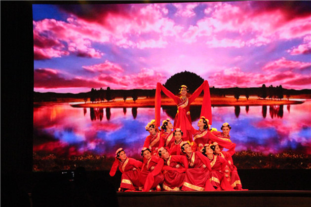 我院舞蹈队第十一个上场,为大家带来了由刘彤老师指导的舞蹈——《心声》。舞蹈队员们身着深红色的藏族服饰,在蓝天草原的背景前翩翩起舞。