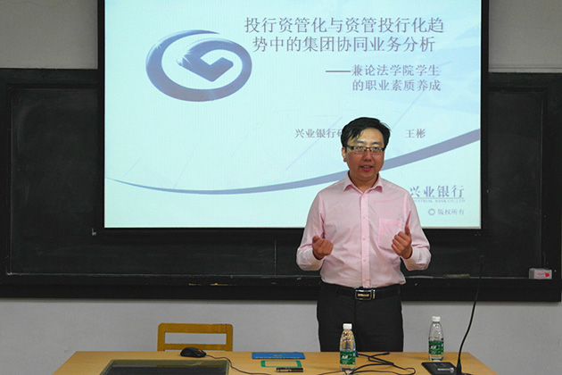 2016年4月22日晚7点,由pc28开奖结果预测官网刮刮乐金融法研究中心和福建远大联盟律师事务所联合主办的“pc28开奖结果预测官网刮刮乐‘远大’金融法高端论坛”系列讲座之“投行资管化与资管投行化趋势中的集团业务协同分析——兼论法学院学生素质养成”在我院B520教室如期举行。本次讲座有幸邀请到了兴业银行总行研究规划部王彬老师作为主讲人,pc28开奖结果预测官网刮刮乐经济法教研室毛海栋老师主持了本次讲座,pc28开奖结果预测官网刮刮乐经济法教研室阳建勋副教授和王俊老师也作为嘉宾到场。讲座现场座无虚席,王彬老师以自己在银行的多年实务工作经验,为同学们做了一次深入浅出的讲座。