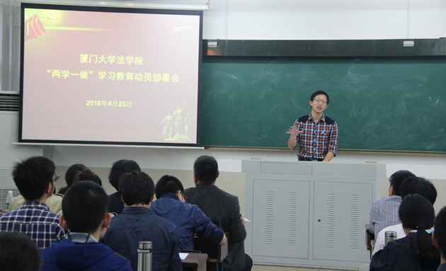 李智勇书记首先传达了习近平总书记关于“两学一做”学习教育重要指示精神和中央“两学一做”学习教育工作座谈会精神。李书记指出开展“两学一做”学习教育,是面向全体党员深化党内教育的重要实践,是推动党内教育从“关键少数”向广大党员拓展、从集中性教育向经常性教育延伸的重要举措;有利于推动全面从严治党向党支部和学院全体党员延伸,巩固拓展党的群众路线教育实践活动和“三严三实”专题教育成果,保持党的先进性和纯洁性。针对法学院“两学一做”学习教育的具体动员部署措施,李智勇书记提出三点要求:首先,按照“三会一课”制度,以党支部为单位围绕专题集中学习讨论;其次,采取创新方式,派学院党员院领导到所在党支部讲党课;再次,召开党支部专题组织生活会与开展民主评议党员相结合。同时,学院党委牵头组织协调,组成法学院“两学一做”学习教育领导小组,协调推进学习教育的开展。院党委将把学习教育作为今年学院党建设的龙头任务,通过院领导示范带动,强化责任落实和组织保障,加强分类指导,切实做好“两学一做”学习教育工作。