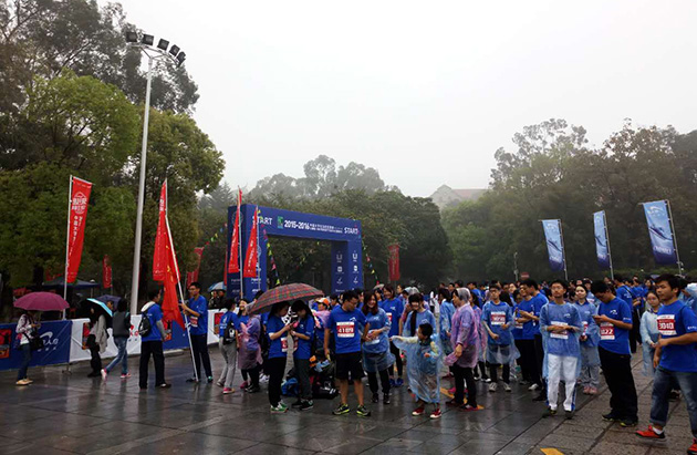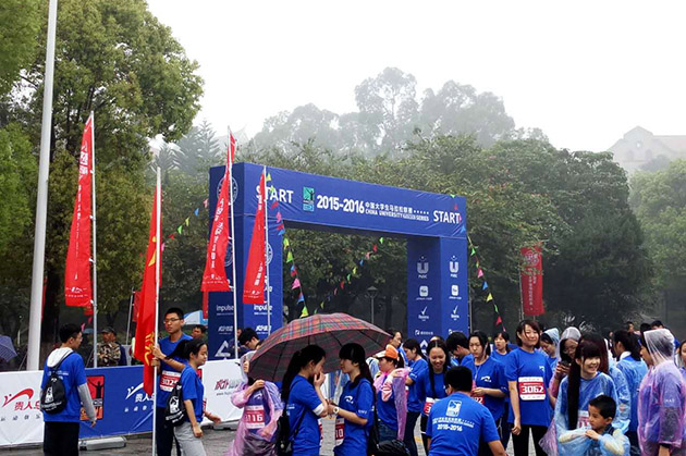 比赛开始时,虽蒙着细雨,同学们身披雨衣或无惧于烟雨蒙蒙,沿着被被布置为马拉松规格赛道的校道出发了。