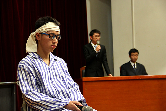 正式比赛由来自嘉庚学院的酷一点的队开场,一出创意十足的包公探案穿越剧使现场气氛迅速热烈起来。紧随其后的我是大明星队则借由物业管理费合同引出了发生法律纠纷后如何合理救济的问题。第三组翻滚的丸子队将场景设定在外国法庭,通过精彩的冲突表演,表现了面对法律与情感的纠葛时不同人的选择。