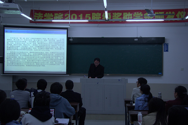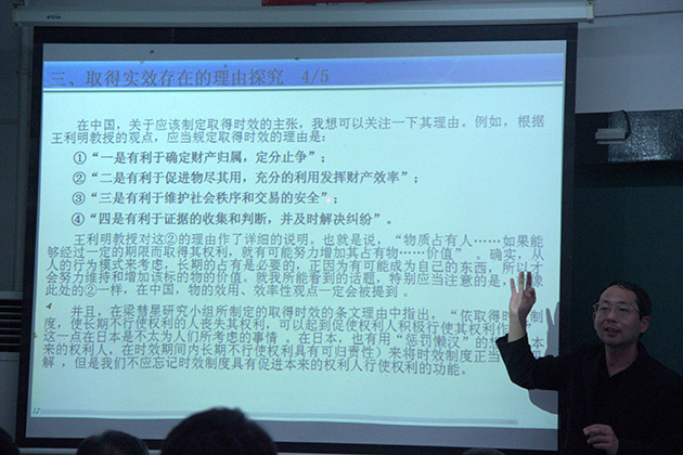 2015年11月27日星期五法学院A201教室,日本北九州市立大学法学部法律科教授、华东政法大学日本法研究中心兼职研究员矢泽久纯先生带来了“取得时效制度的存在理由”主题讲座。徐国栋教授担任讲座的主持人兼评议人,刘永光副教授担任现场翻译,来自各年级的学生们共同聆听了本次讲座。