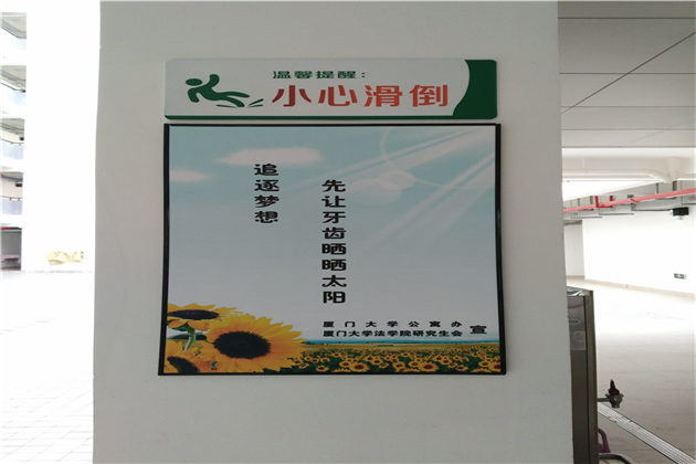 中午12:40,在研会办公室的组织下,十三名工作人员于海韵学生公寓门口集合,简单分配人员后,分别于海韵学生公寓4、9、11、14、17栋每层的楼梯道张贴了“世界上最遥远的距离:我在你面前,你在玩手机…”的提示标语;并于每栋宿舍进门处张贴了“追逐梦想,先让牙齿晒晒太阳。”的KT板标语。