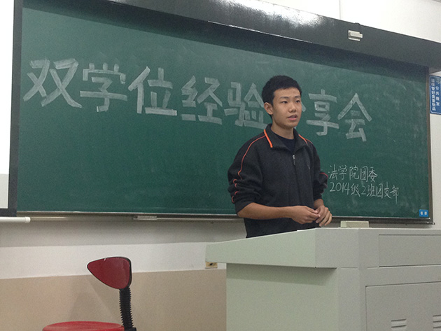 12月2日19时,2014级2班双学位经验分享会在法学院A201教室举行。由于大一同学对于双学位制度充满了一系列的好奇与疑惑,为积极响应团委要求以及满足大一同学的需求,大二二班特举办此次双学位经验分享活动,借由邀请大二二班嘉宾分享经验,旨在为大一同学们答疑解惑,帮助大一同学们更加了解双学位学习的状况,进而做出适合自己的学习生活规划以及职业规划。