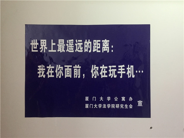 当下,于校园中,随处可见拿着手机低头独自赏玩的“低头族”。因此才有了这次“世界上最遥远的距离:我在你面前,你在玩手机”标语的诞生,以提示来往同学注意脚下安全,同时呼吁同学们放下手机,多与身边同学交流。