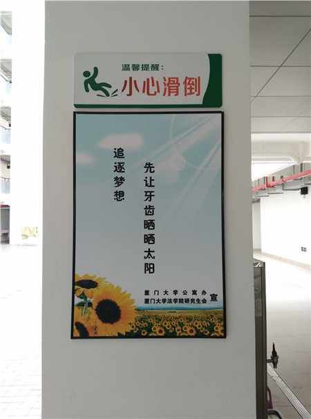 微笑是善良、友好、赞美的象征;是对他人的理解、关心和爱的表达;是礼貌修养的表现;是积极乐观的生活情趣。因而,工作人员在公寓楼栋入口处张贴 “追逐梦想,先让牙齿晒晒太阳”的标语以鼓励大家保持微笑。
