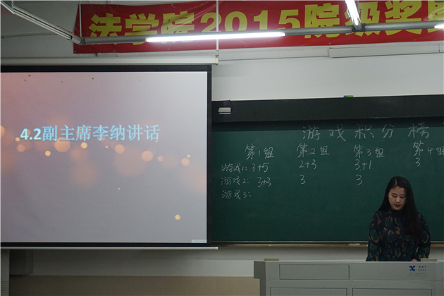 分管学术部、外联部和女生部的李纳副主席最后一个上台汇报工作。自新学期以来,其所分管的学术部主要承担了四大任务:1.协助学院评奖评优;2.承担学院各项讲座的举办;3.举办南强学术沙龙;4.第九届“厦门仲裁”杯大学生辩论赛。外联部则主要完成各项活动的赞助,以及协助副主席李纳完成八院迎新百度糯米APP的推广。作为法硕联合会的校友联络部,目前正在协助法硕联合会常务副会长李纳准备“第三届兼职硕士生指导教师代表座谈会暨专题讲座”的志愿者招募等前期工作和在职法硕与全日制法硕篮球友谊赛的前期准备工作。女生部则与组织部合办新一届研会成立以来的第一次例会活动,协助体育部完法学院第一届趣味运动会暨素拓活动,并成功举办了女生部的招牌活动“女生茶话会”。