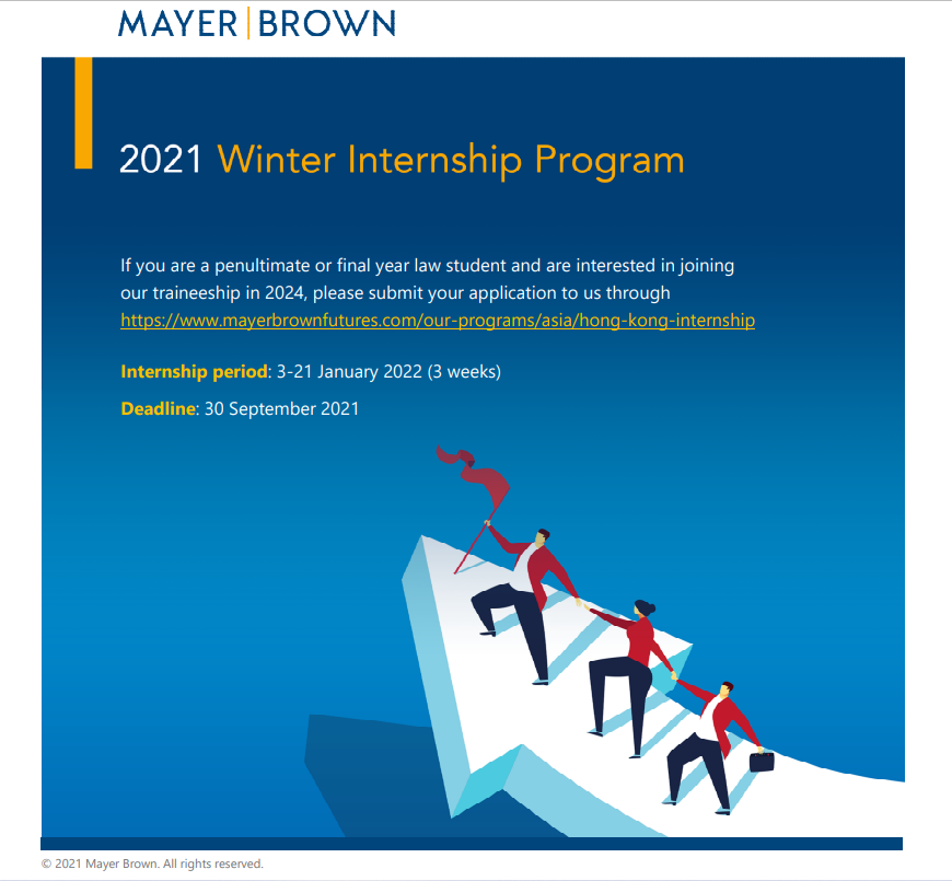 关于孖士打(Mayer Brown)律师事务所2021冬季实习项目的申请通知 发布人: 李宏伟 | 发布时间: 2021-09-23 | 阅读数: 报名截止时间:2021年9月30日 实习时间:2022年1月3日-21日(3周) 申请网址:https://www.mayerbrownfutures.com/our-programs/asia/hong-kong-internship 报名同学请点击申请网址,按要求完成申请步骤。 成功通过线上测试与面试的同学,请发送邮件至markli@xmu.edu.cn 邮件主题:Mayer Brown律师事务所2021冬季实习项目 邮件内容:学号、姓名、专业、年级、联系电话